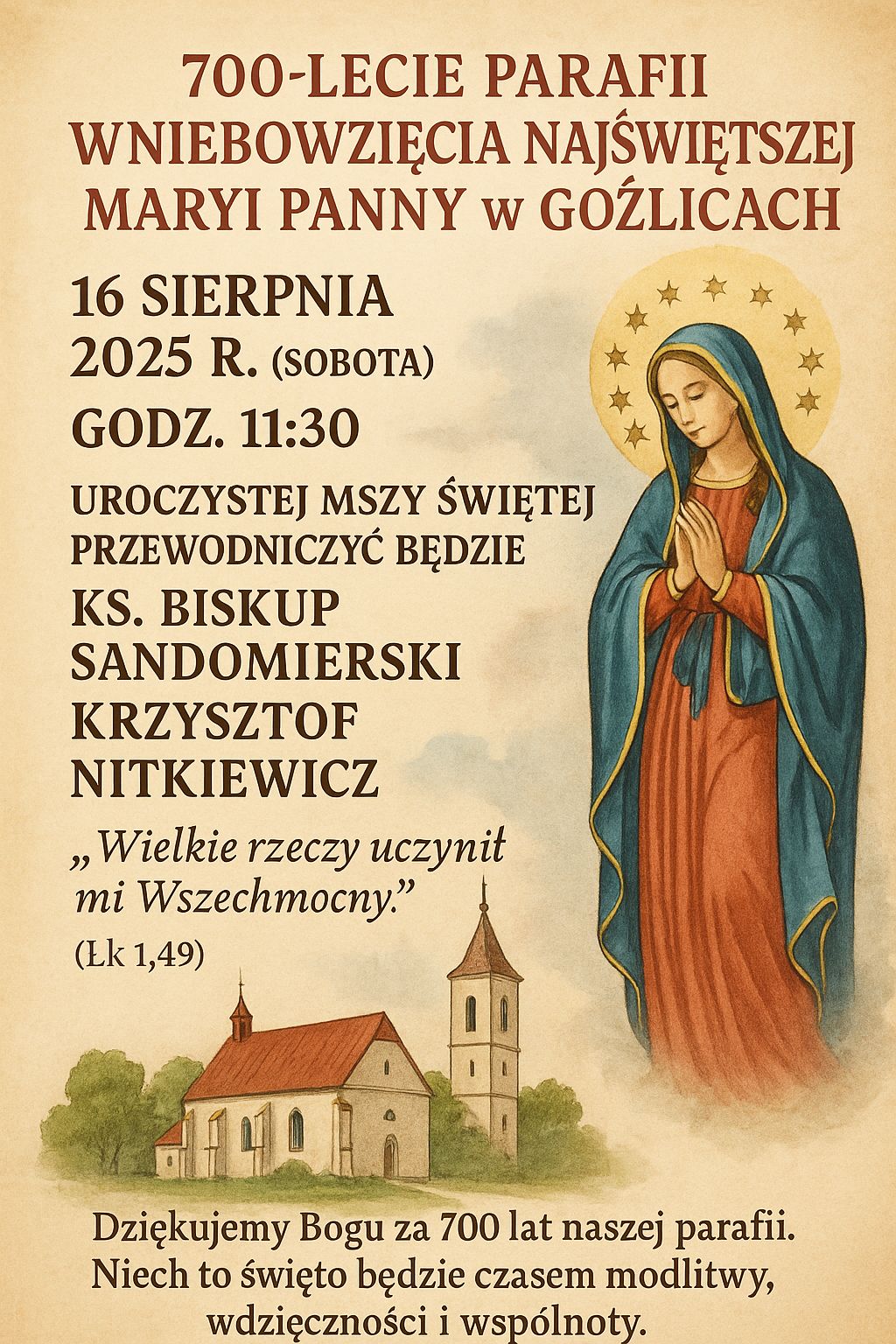 Jubileusz 700-lecia parafii w Goźlicach  sobota, 16 sierpień 11:30 sobota, 16 sierpień 13:00 Goźlice Goźlice 5127-640 Klimontów Kategorie: Diecezjalne, Wydarzenia, Zaproszenia W roku 2025 parafia pw. Wniebowzięcia Najświętszej Maryi Panny w Goźlicach obchodzi jubileusz 700-lecia swojego istnienia. Choć początki wspólnoty i sama świątynia sięgają XII wieku, za datę oficjalnej erekcji parafii uznaje się rok 1325. PODZIEL SIĘ Facebook Twitter